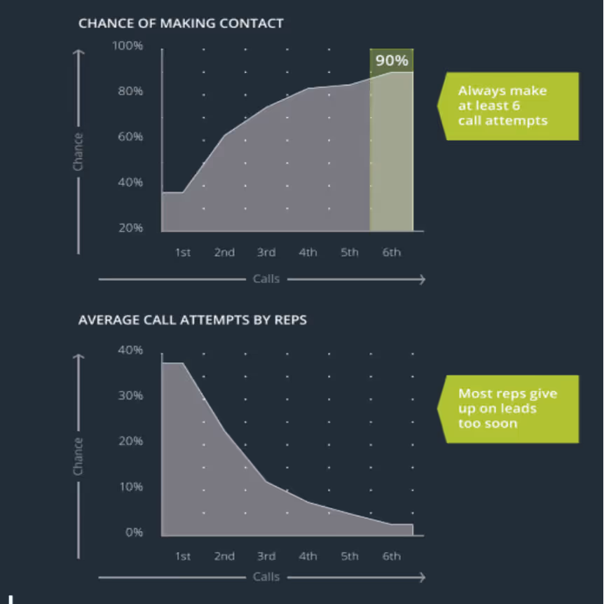 By the time your organization has called a lead six times, you have a 90% chance of hearing a voice on the other end of the line. And yet, fewer than 10% of sales reps actually make it to the sixth call—most give up after a single call.
