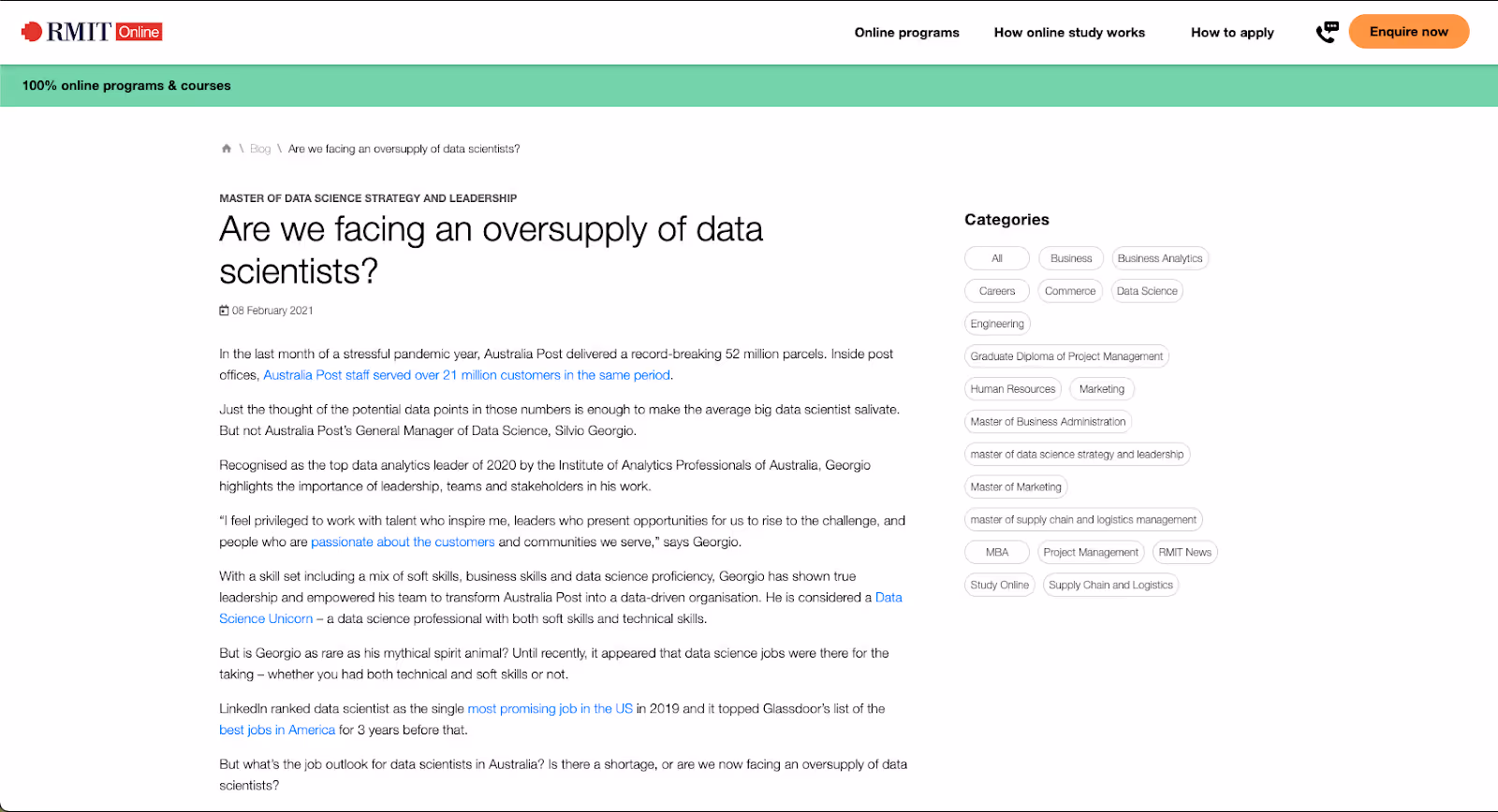 For instance, RMIT Online is an online university, and they’ve created a piece of content that asks and answers the question of whether we have an oversupply of data scientists.