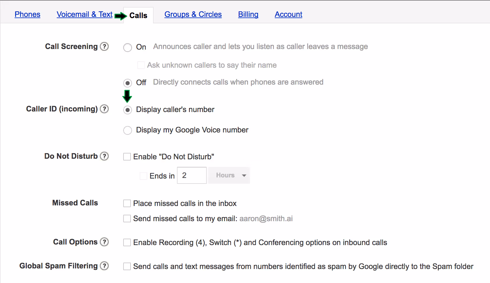 3. Then select the Calls menu at the top of your screen. Finally, select the Display caller’s number radio button from the options for “Caller ID (incoming)”.