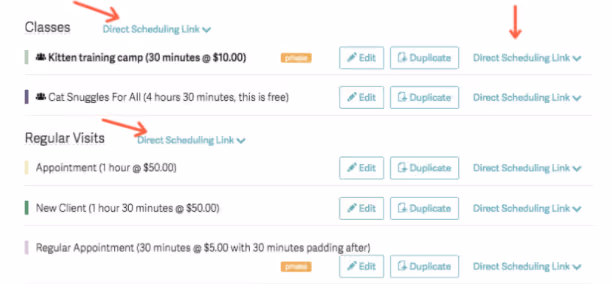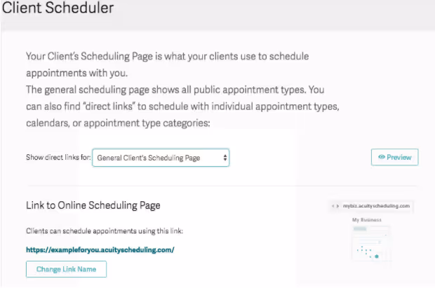 To get started, you can find a full list of the direct links to your Acuity Scheduling calendar by going to the Client’s Scheduling Page, and then clicking on Scheduling Page Link.