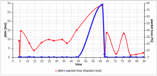 This above VoIP quality analysis graph shows a call with a sudden spike in jitter (30 milliseconds) and packet loss (80%). The participants on this call would have had a sudden experience of not hearing audio for about 15 seconds. This is common when the internet connection used for a VoIP call is temporarily saturated (overloaded) with too much other traffic.