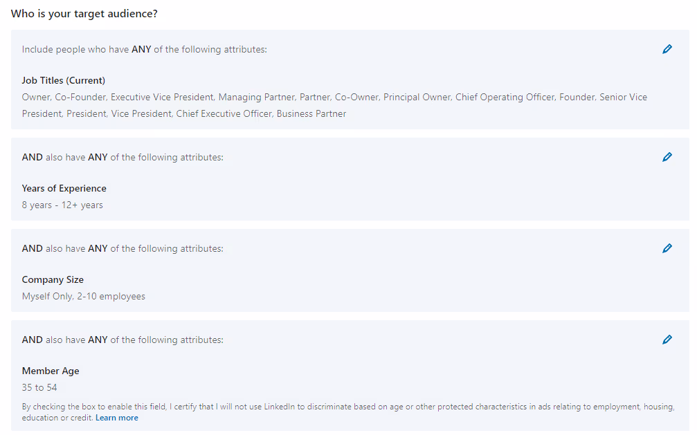 Next, it’s time to build your audience. Again, LinkedIn shines as a platform to reach B2B audiences, so make sure to take advantage of all of the business-specific targeting at your disposal.