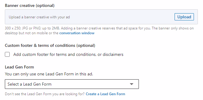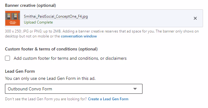This time, when you see the above messaging at the beginning of the ad creation process, you will select your form and upload a banner creative to be associated with the form.