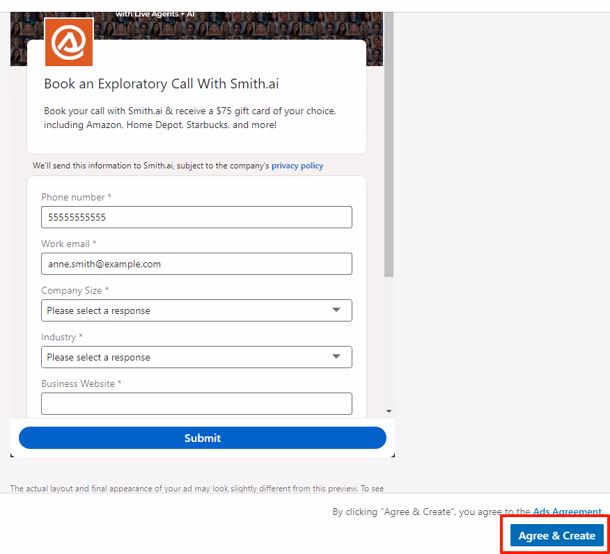 Once you have fully built your form, click “Agree & Create” in the bottom right, which will take you back to the section where you create your ad.