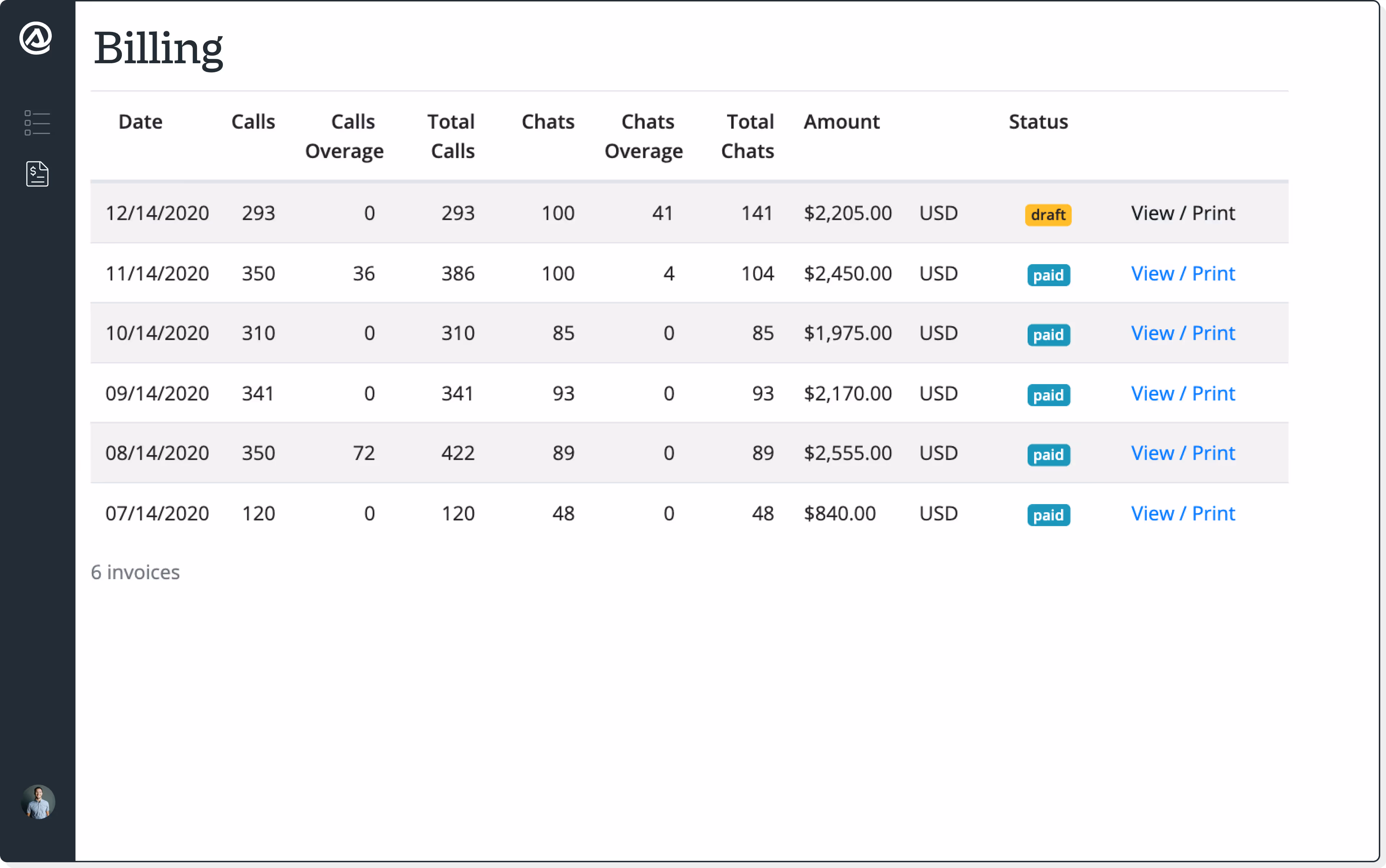 So we built a partner portal where agencies can manage all of their clients’ answering services and live chat accounts in one place. Our new portal allows agencies to track every conversation with a lead, and manage every invoice, for all clients.