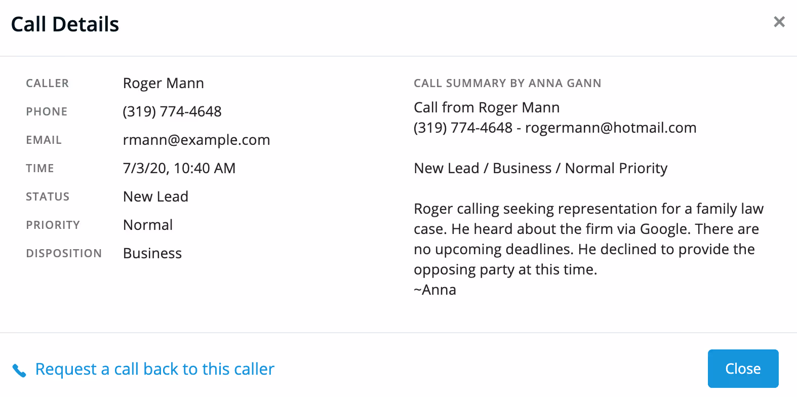 In the virtual receptionist call dashboard, you’ll see a Call History section, where you have access to every call throughout the history of this account. Click into each conversation for: