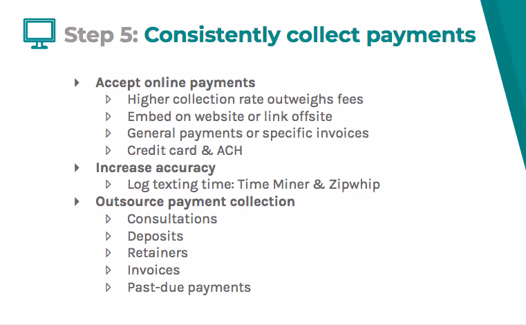 Now, one of the other things that I recommend is that you outsource payment collection. So if you have retainers that you have invoices that are coming due, or even past due, have a receptionist service reach out proactively to those people. You can even give them a list of the names and emails so it's not just one at a time, but you know, 20 at a time and they can reach out and collect payment on your behalf.