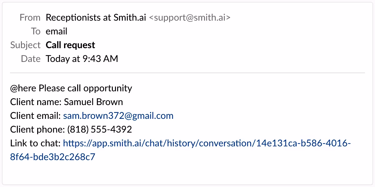 Your Smith.ai Chat playbooks can now trigger a notification in your team’s Slack channel, requesting a callback from an online lead.