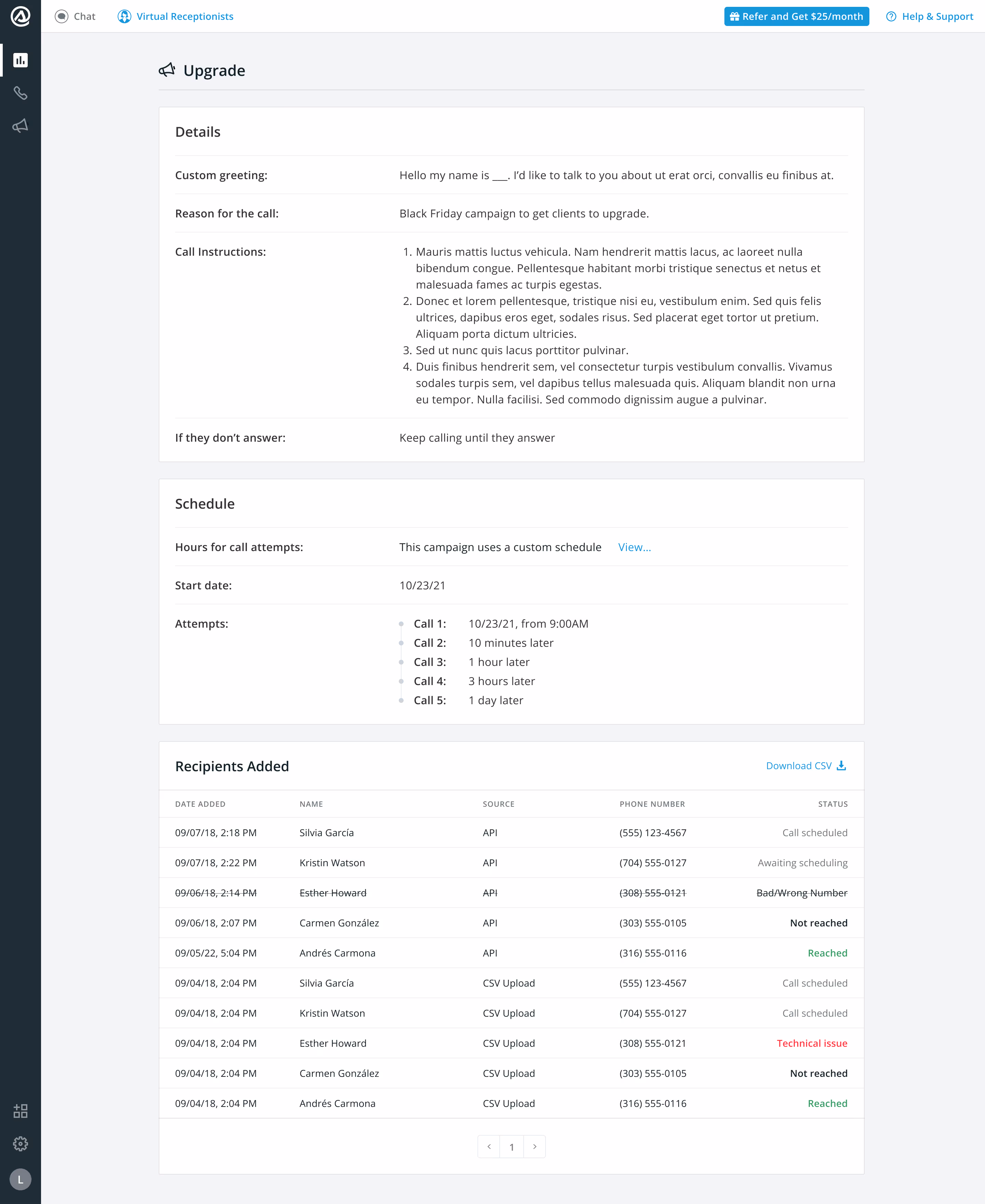 Here you can see the progress of each recipient within the campaign — marked by Status — and easily identify how many call attempts we've made to them, and whether or not we've been able to connect (speak with) them.