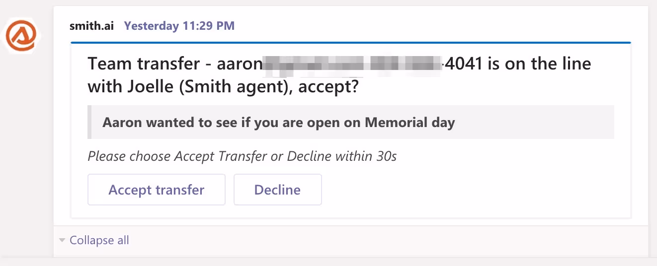 At Smith.ai, we are always seeking new ways to work on the platform you already use. So, rather than notifying you of a call transfer via phone, we can ping a Teams channel instead. The notification will appear on your computer, tablet, and phone — anywhere you have the app installed. And with a quick glance at the caller details (name and why they called), you can click to accept or reject the transfer.