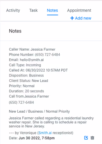 When you connect Smith.ai with HighLevel, all calls handled by Smith.ai’s receptionists will now appear in HighLevel. With this integration, after every call, Smith.ai will: