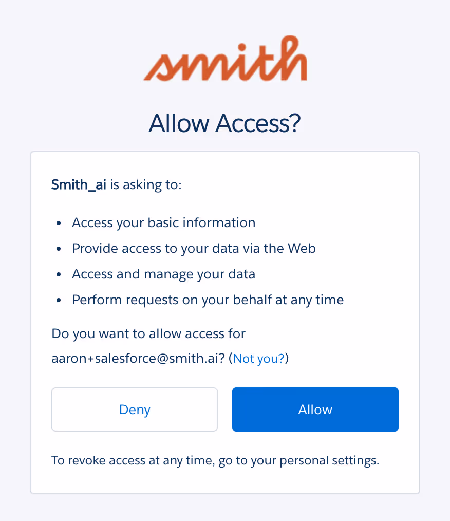 3. When prompted, approve access to Smith.ai by clicking "Allow"