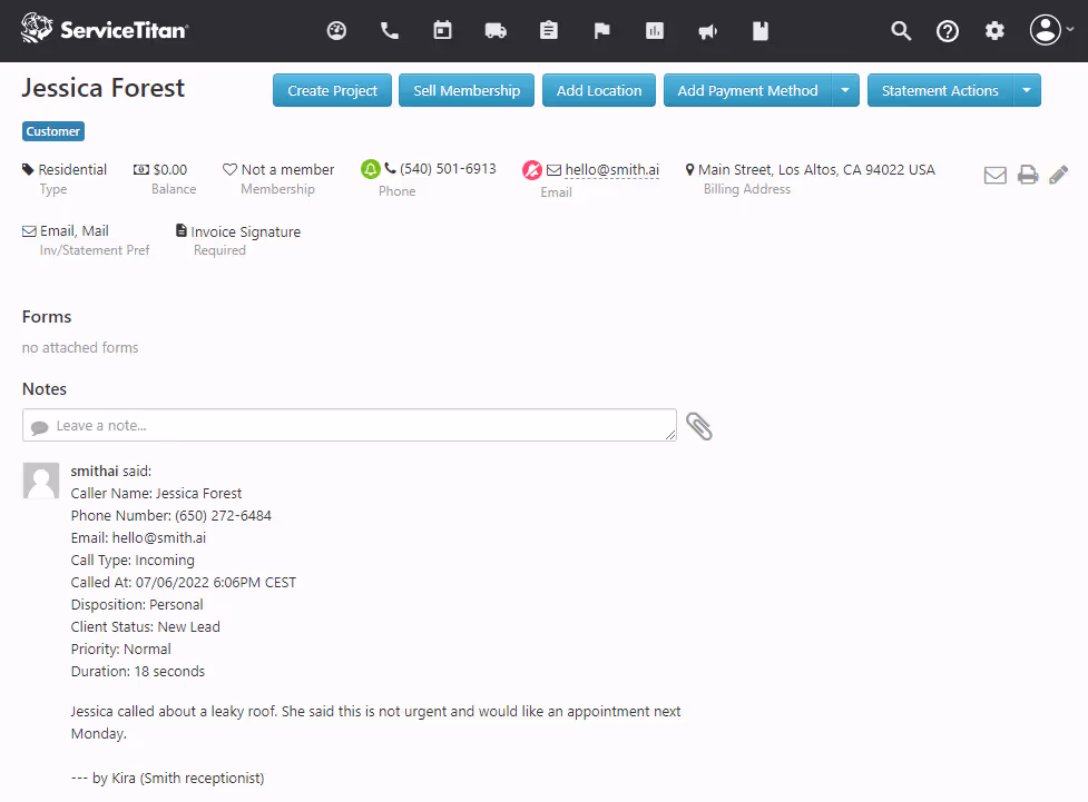 Smith.ai’s integration with ServiceTitan eliminates the need to manually enter every call and constantly check email, Slack, and text messages for Smith.ai call notifications, saving you time. By reducing data entry chores and keeping all of the employees in the loop on lead and client interactions by phone, this integration also helps you run a more efficient and productive home service business.