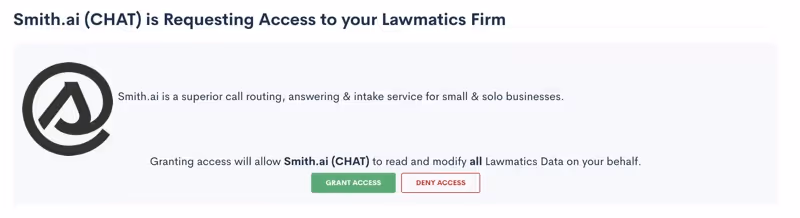 That’s it! You’ll be sent back to Smith.ai’s dashboard where you should see Lawmatics is now connected. All new chat conversations will appear in your Lawmatics dashboard as new contacts or new matters under existing contacts. Keep an eye on these leads and use Lawmatics to follow up and manage them.