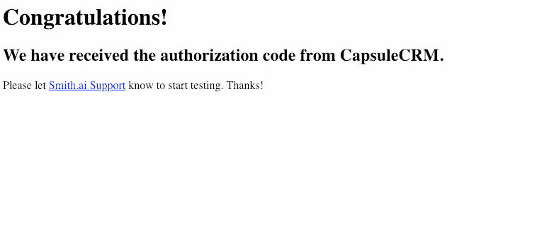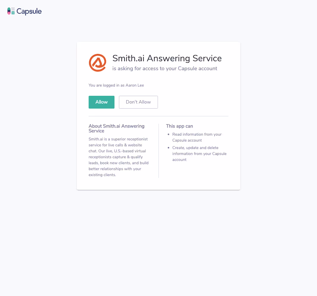 4. Email support@smith.ai again to notify us that you have approved our access to your Capsule account. We will begin testing the integration and will contact you as soon as we have confirmed that the integration is working properly.