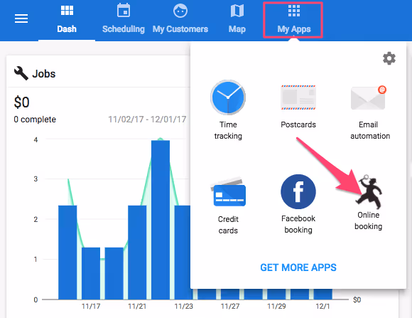 1. Login to your Housecall Pro account, click on "My Apps," and then select "Online booking."