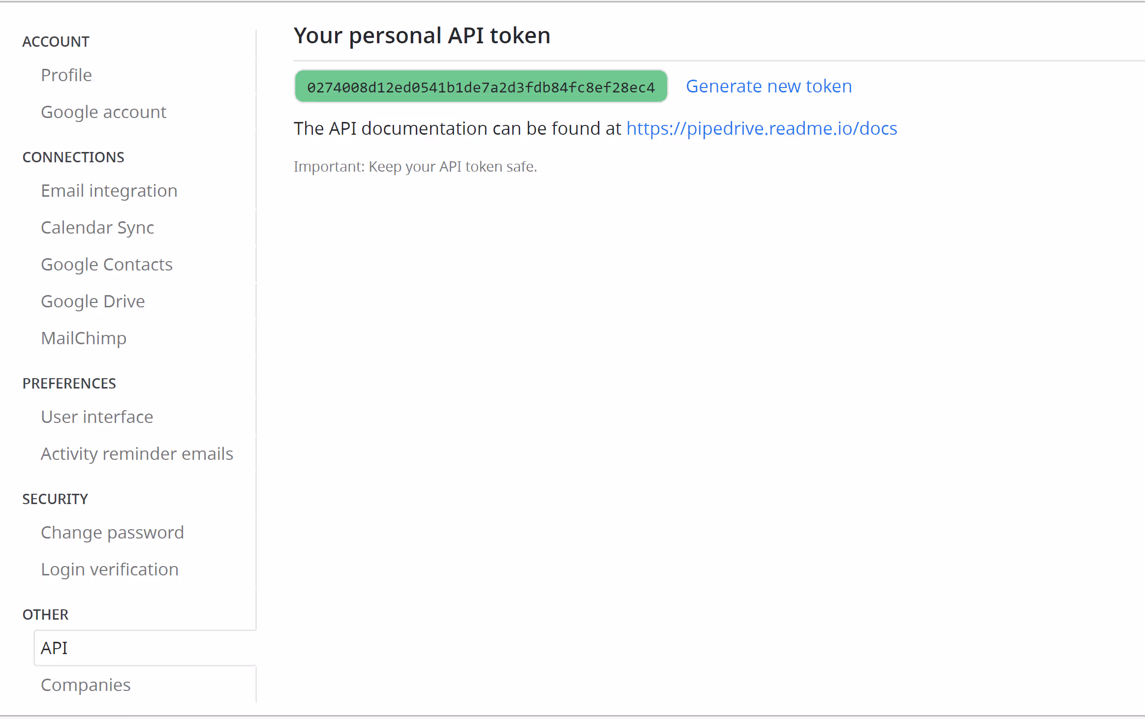 3. Copy your personal API token and email it to us at support@smith.ai with the subject line, "Pipedrive CRM Integration."