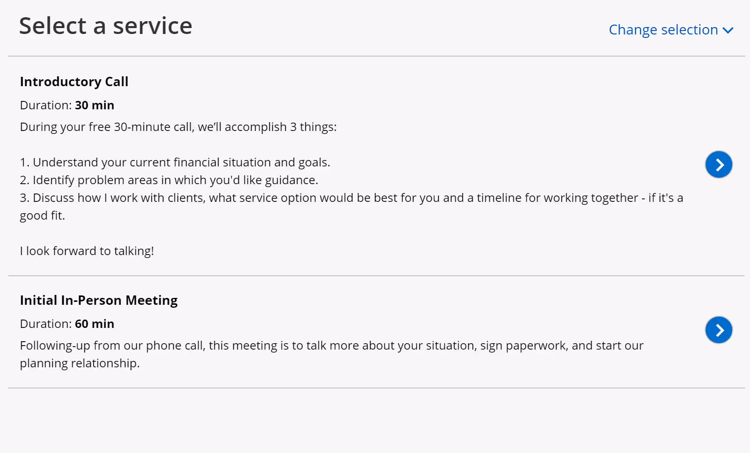 When people saw this page and emailed to make an appointment, I suggested that they use my online calendar instead of playing email tag. To make this easier, I placed a link in my email signature and also on various points on my website allowing people to make an appointment with me. Using the ScheduleOnce platform, they were able to see what times I was available and pick one that suited them. Appointments were broken down into Initial Call, Initial Client Kickoff Meeting, and Existing Client Meeting. Everything was self-explanatory.