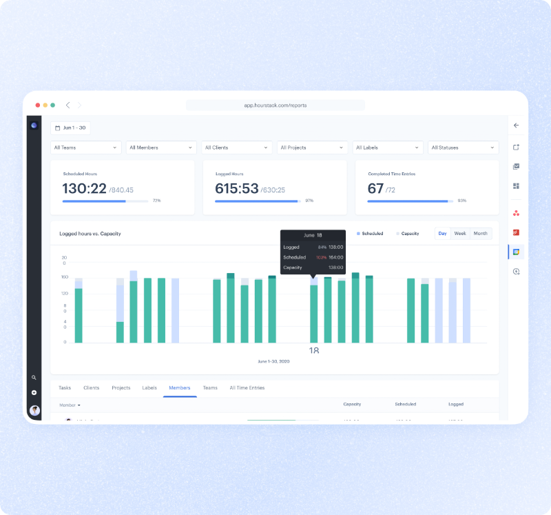 This tool is great for small collaborative teams that need to track availability and hours that people have to dedicate to certain projects. There’s an option to create time-off logs so that you know when everyone will be available, and you can even see timed sessions or events that went over their allotment because they’re highlighted in red.
