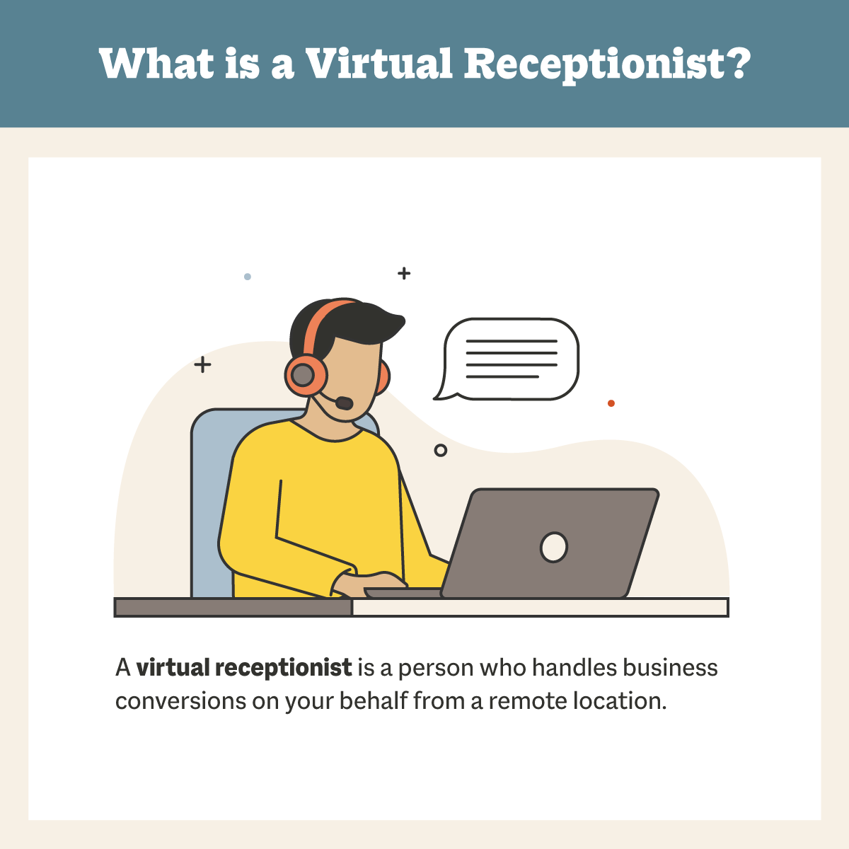 A virtual receptionist is a remote call-handling service that manages incoming phone calls and front-line customer inquiries without physical presence at your business location. Virtual receptionists perform almost all the same tasks as in-house reception staff — taking inbound calls, responding to customer inquiries, screening leads, and scheduling appointments — but operate remotely.