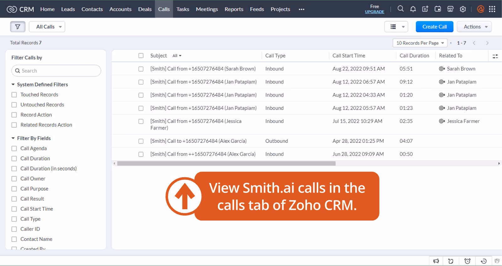 When you connect Smith.ai with Zoho, your Smith.ai calls will now appear in Zoho. After every call, Smith.ai will: